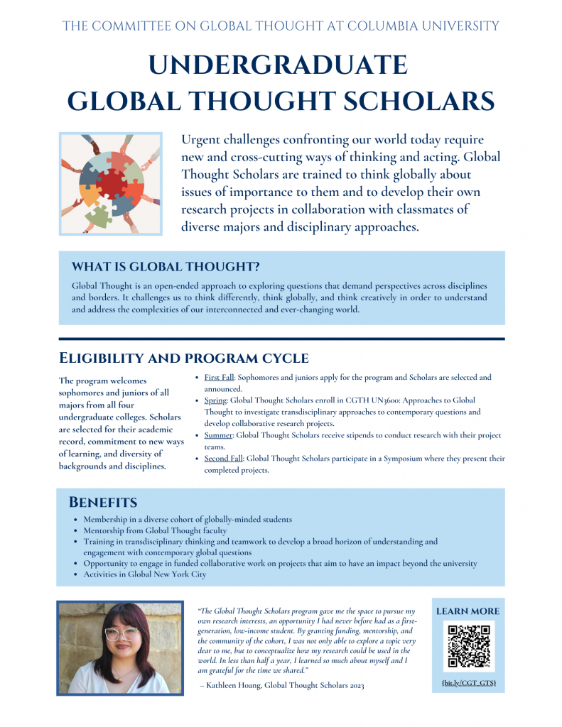 Global Thought Scholars are sophomores and juniors of all majors. Each year, Scholars are trained to think globally about issues of importance to them and to develop their own research projects in collaboration with classmates of diverse majors and disciplinary approaches. Interested students can learn more at a virtual information session on September 19 or October 8, then plan to apply by October 12.