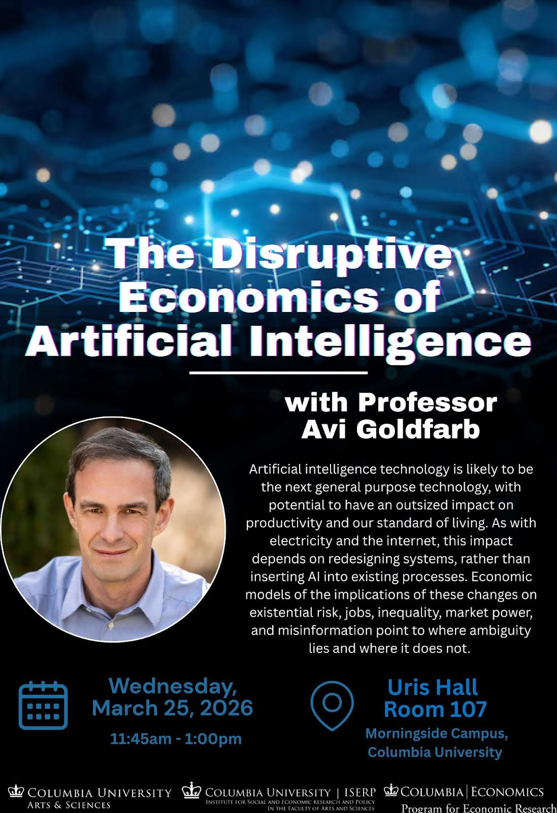 The Program for Economic Research (PER), the Office of AI Initiatives and Support (ISERP), and the Provost’s Office will be hosting Avi Goldfarb for a day-long series of events focused on AI. Our public-facing talk, “The Disruptive Economics of Artificial Intelligence,” will take place on Wednesday, March 25, from 11:45am–1:00pm, and registration is now open!