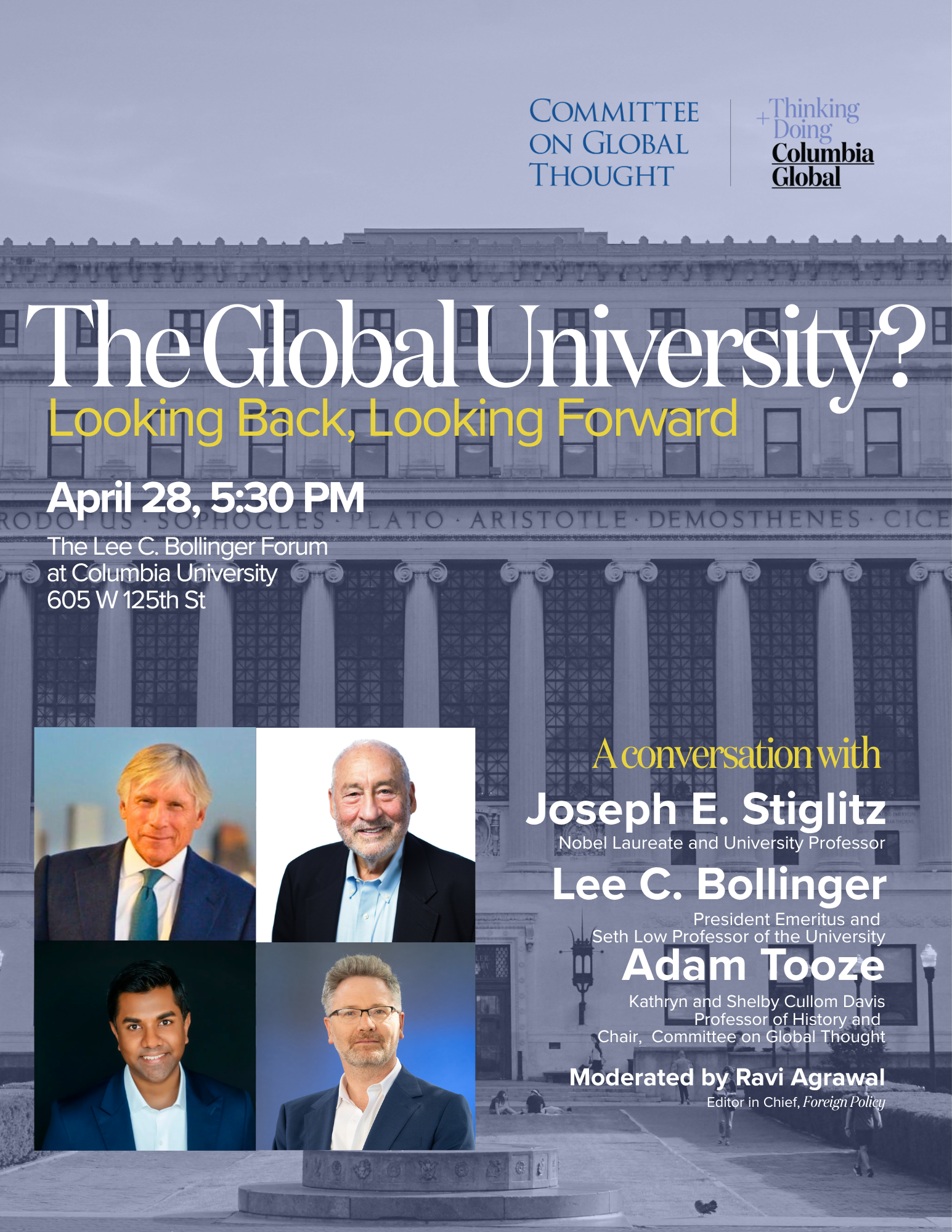 The context in which CGT was founded (on the cusp of “globalization”) is markedly different in 2026, and Columbia itself is also changed. To mark CGT’s 20th year, we are convening a discussion with President Emeritus Bollinger, CGT’s founding chair Joseph Stiglitz, and Adam Tooze, moderated by Ravi Agrawal, Editor in Chief of Foreign Policy. The panel will reflect on how conceptions of “the global” have evolved since CGT’s founding, and imagines what is ahead.